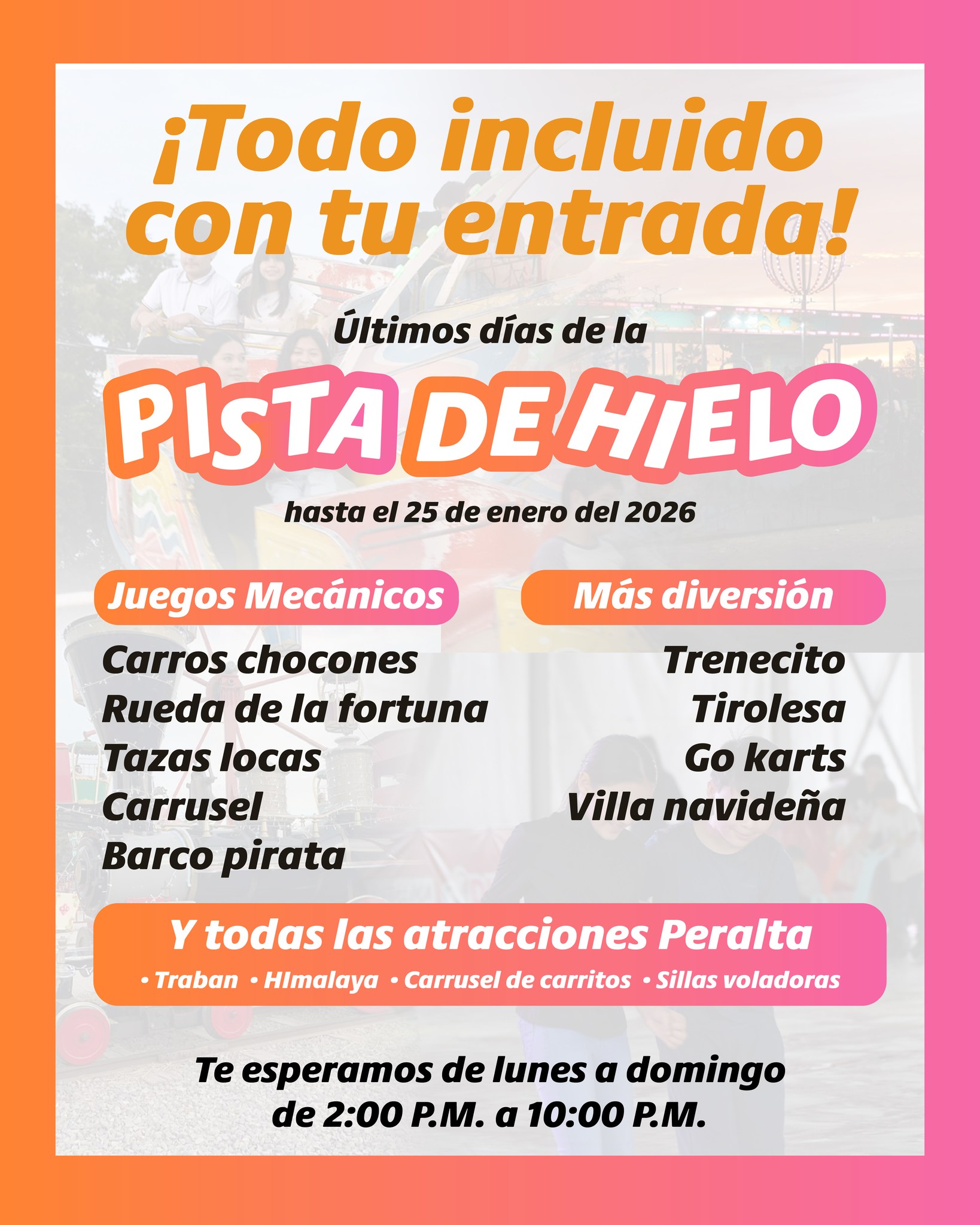 Las autoridades informaron que la atracciÃn invernal estarà disponible Ãnicamente hasta este domingo 25 de enero. Para despedirla, ofrecen un paquete de «DiversiÃn con todo incluido» por un costo muy accesible de $75 pesos por persona.