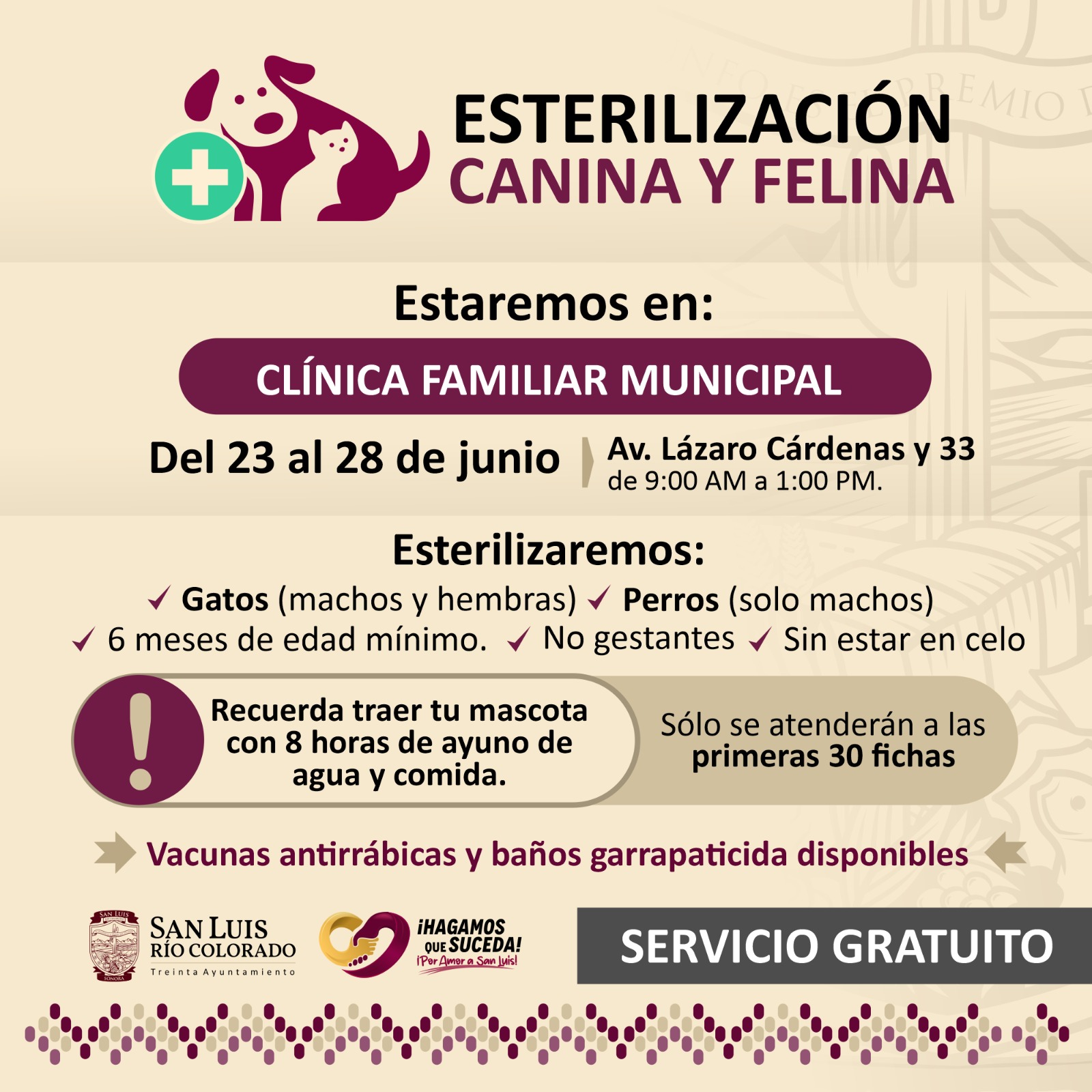 La DirecciÃn de Salud PÃblica Municipal de San Luis RÃo Colorado invita a la ciudadanÃa a aprovechar los Ãltimos dÃas de la jornada gratuita de esterilizaciÃn para perros y gatos. Esta iniciativa busca promover el bienestar animal y el control responsable de la poblaciÃn de mascotas.
