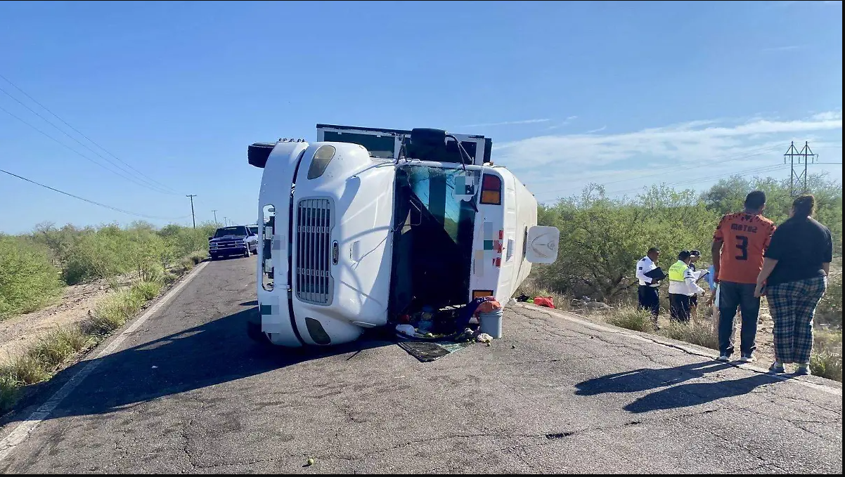 Elementos de la PolicÃa Estatal, PolicÃa de TrÃnsito de Empalme y Guaymas, asà como Bomberos, acudieron al sitio para apoyar en las labores de rescate. ProtecciÃn Civil informà que la unidad quedà obstruyendo la carretera y se realizaron maniobras para retirarla.