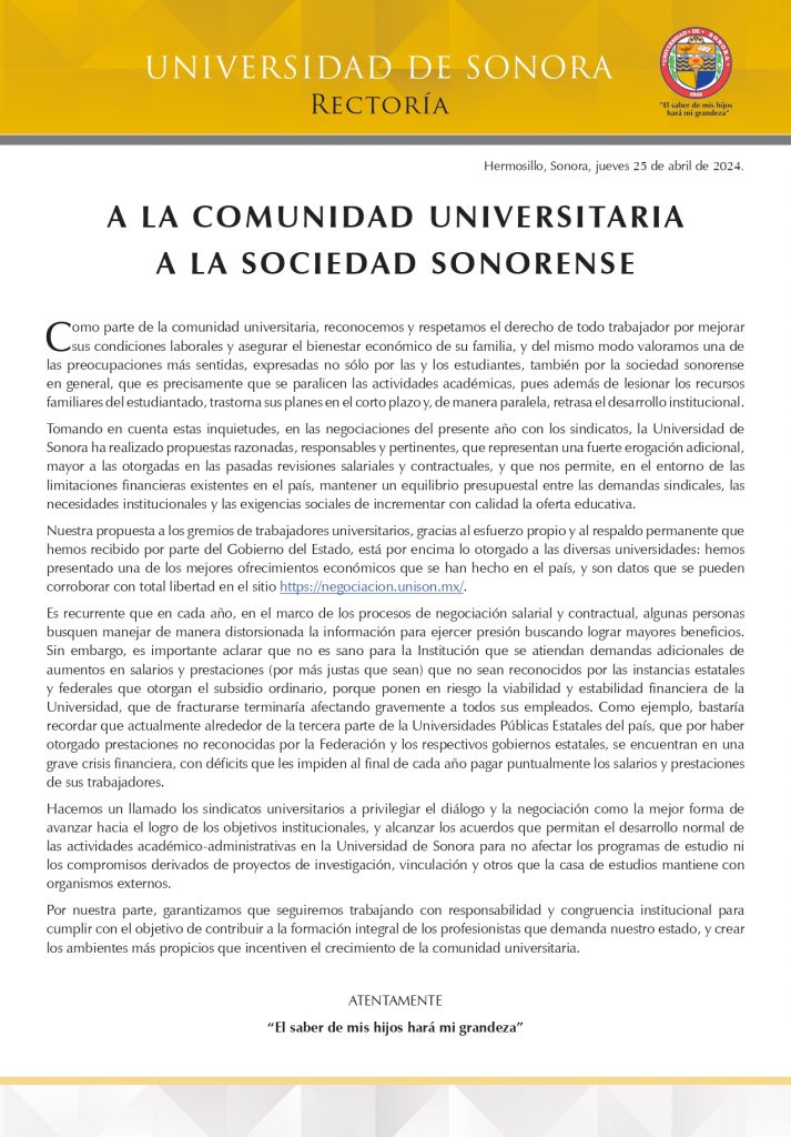 Por otro lado, Unison hizo un llamado a los sindicatos que se encuentran en huelga para privilegiar el diÃlogo y la negociaciÃn, para que asà se permita el desarrollo normal de las actividades acadÃmicas y administrativas.
