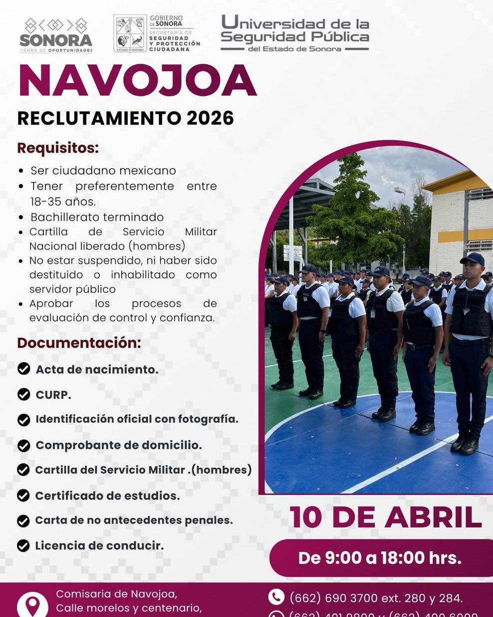 La cita para los interesados es este próximo viernes 10 de abril en las instalaciones de la Comisaría de Navojoa, ubicada en la colonia Constitución. El personal de reclutamiento estará recibiendo documentación y brindando información sobre los beneficios, becas de formación y el plan de carrera policial en un horario de 9:00 a 18:00 horas. Esta iniciativa forma parte de la estrategia estatal para profesionalizar los cuerpos de seguridad, garantizando que los nuevos elementos cuenten con una formación integral basada en el respeto a los derechos humanos y el bienestar de las familias sonorenses.
