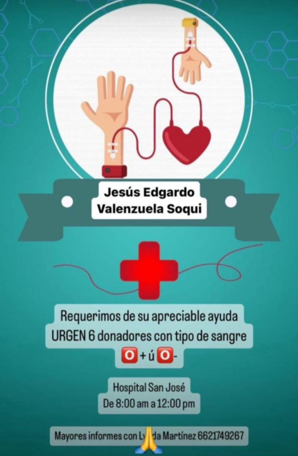 Necesitamos tu ayuda para salvar una vida. Requerimos 6 donadores de sangre tipo O+ u O- para JesÃs Edgardo Valenzuela Soqui.