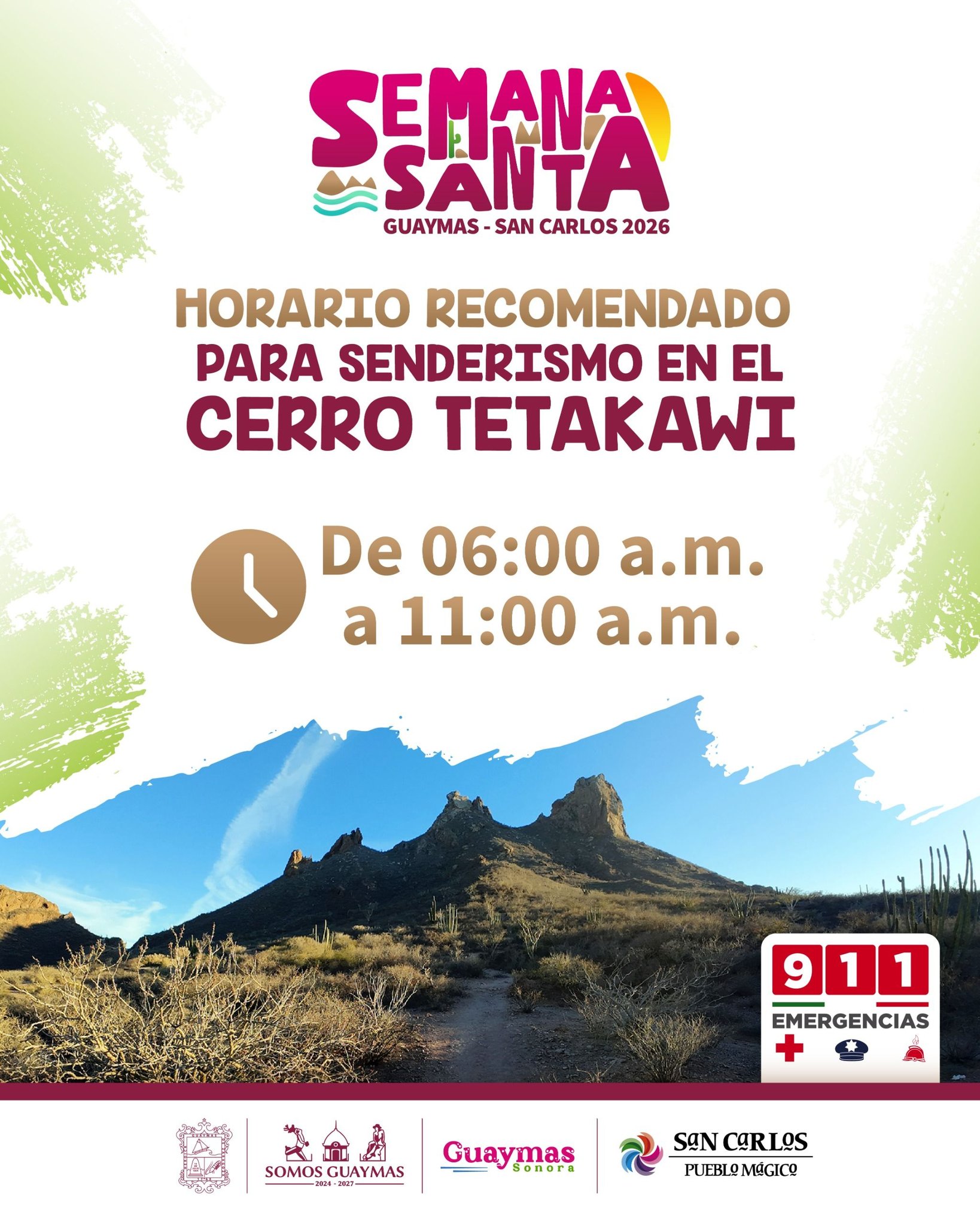 San Carlos, Nuevo Guaymas; a 1 de abril de 2026.- El Cerro Tetakawi, Ãcono indiscutible de Sonora, se prepara para recibir a cientos de senderistas durante esta Semana Santa. Sin embargo, para garantizar la seguridad de los visitantes y evitar deshidrataciones o accidentes, la Unidad Municipal de ProtecciÃn Civil ha establecido un horario estricto para el ascenso: de 6:00 a.m. a 11:00 a.m.