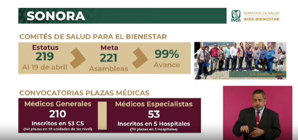 Zoà Robledo Aburto, director General IMSS Bienestar, durante la conferencia de prensa del Gobierno de MÃxico, presidida por el presidente AndrÃs Manuel LÃpez Obrador, informà sobre los ComitÃs de Salud para el Bienestar, dÃnde Sonora cuenta con el 99% de asambleas instaladas, de las cuales se llevaron a cabo en 221 centros de salud y de las 141 vacantes de mÃdicos generales hay un reporte de 210 personas interesadas en ir a trabajar a estos centros de salud, en el caso de mÃdicos especialistas son para cinco hospitales de zonas remotas y marginadas, donde se han inscrito 53 mÃdicos especialistas de las 70 plazasÂofertadas.