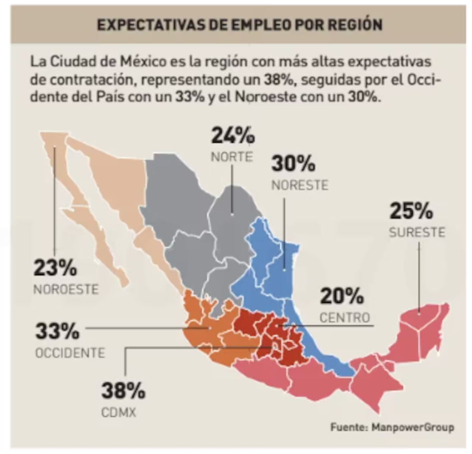 La regiÃn Noroeste de MÃxico, que incluye a Sonora y Baja California, registrà una de las expectativas mÃs bajas de crecimiento en empleo a nivel nacional, con una tasa del 23%, segÃn el mÃs reciente informe de ManpowerGroup.